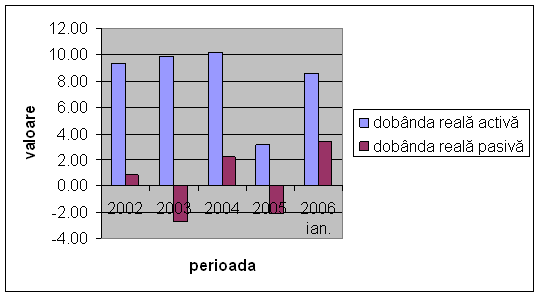 În ceea ce priveste evolutia ratelor dobânzii reale (graficul 1.2.), se constata permanenta valorilor real pozitive pentru dobânzile active în perioada analizata. Nu acelasi lucru este valabil pentru dobânzile reale pasive. Acest fenomen al iluziei monetare se poate explica atât prin gradul mai redus al culturii bancare si volatilitatea ratei inflatiei, cât si prin faptul ca populatia, de regula, se ghideaza dupa valorile nominale, acestea fiind mai usor de calculate.[1]