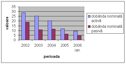 Analizând graficul 1.1. remarcam faptul ca în perioada 2002 - 2006, perioada de expansiune a creditului acordat sectorului privat, dobânzile active nu au înregistrat scaderi majore decât începând cu anul 2005 . Diminuarea relativ modesta adobânzilor la creditele nou acordate ar reprezenta un alt argument în favoarea ideii de piata bancara oligopolista, însa putem identifica suplimentar si alte explicatii cum ar fi: asteptari superioare privind nivelul inflatiei, lacune în implementarea principiilor de guvernanta corporatista, precaritate în exercitarea drepturilor creditorilor (în special dificultati în executarea creantelor) si posibilitatea de o obtine câstiguri superioare, mai ales în conditiile în care multe banci-mama din Europa traverseaza o perioada caracterizata de profituri mai reduse.
