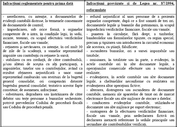 - nedeclararea in termenele prevazute de lege a veniturilor si bunurilor impozabile; neintocmirea la termen, conform prevederilor legale a documentelor primare si contabile privind veniturile lor precum si sustragerea de la plata impozitelor taxelor si contributiilor datorate statului pentru activitatile neautorizate se pedepsesc cu amenzi intre 100000 si 300000 Lei pentru persoana fizica si intre 100000 si 2000000 Lei pentru persoana juridica;