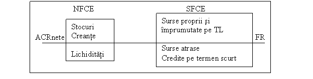 NFCE=nevoia de finantare a ciclului de exploatare; SFCE=sursele de finantare;FR=fond de rulment;ACRnete=FR=ACR-DCR;ACRnete=active circulante nete(stocuri+creante)-datorii curente; ACRnete=active circulante nete; DCR=datorii curente; FR=CPM-IMO;CPM=capital permanent; IMO=imobilizari