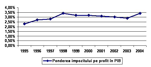 Efectele induse de impozitul pe profit asupra veniturilor bugetare sunt surprinse pe baza ponderii detinute de acesta in produsul intern brut. Pentru anii 1995 – 2004 situatia este redata in tabelul urmator: