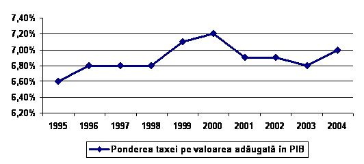 Finalitatea procedurilor fiscale de asezare a taxei pe valoarea adaugata este judecata prin prisma efectelor induse de aceasta asupra veniturilor publice. Ponderea incasarilor din taxa pe valoarea adaugata in produsul intern brut in intervalul 1995 – 2004 este: