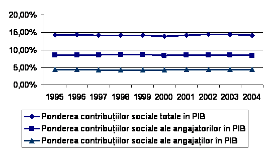 Contributiile de asigurari sociale au o pondere importanta in totalul veniturilor publice. Ponderea detinuta de acestea, in expresie cumulata, precum si diferentiat pe cele doua categorii principale de contributori, respectiv angajatori si angajati, in produsul intern brut, in perioada 1995 – 2004 este reflectata in tabelul urmator: