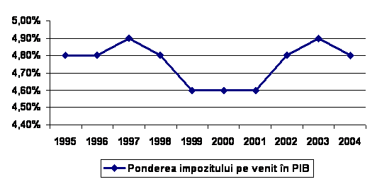 Contributia impozitului pe venit la formarea fondurilor publice de resurse financiare poate fi judecata prin prisma ponderii acestuia in produsul intern brut. In perioada 1995 – 2004 valorile acestui indicator sunt surprinse in tabelul urmator: