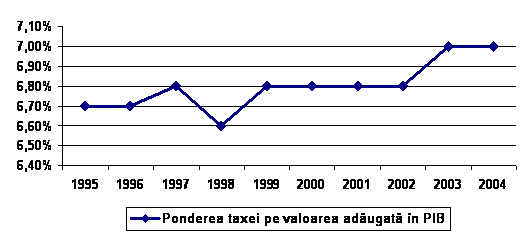 Ponderea taxei pe valoarea adaugata in produsul intern brut, in perioada 1995 – 2004 este prezentata in urmatorul tabel: