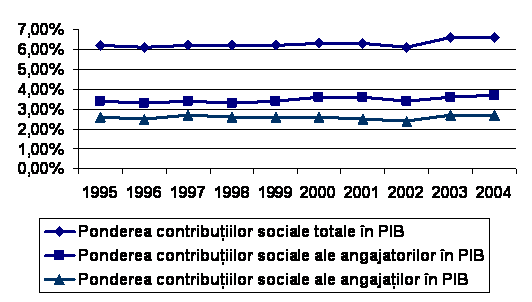 Contributiile de asigurari sociale au o pondere importanta in totalul veniturilor publice. Ponderea detinuta de acestea, in expresie cumulata, precum si diferentiat pe cele doua categorii principale de contributori, respectiv angajatori si angajati, in produsul intern brut, in perioada 1995 – 2004 este reflectata in tabelul urmator: