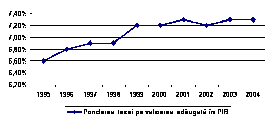 Ponderea veniturilor bugetare sub forma taxei pe valoarea adaugata in produsul intern brut, pentru anii 1995 – 2004 este prezentata in tabelul de mai jos: