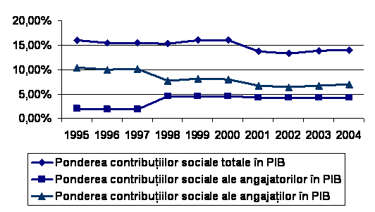 Ponderea detinuta de contributiile de asigurari sociale in produsul intern brut, in perioada 1995 – 2004, este reflectata in tabelul urmator: