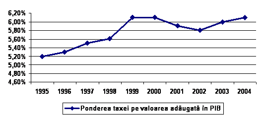 Ponderea taxei pe valoarea adaugata in produsul intern brut in intervalul 1995 – 2004 este urmatoarea: