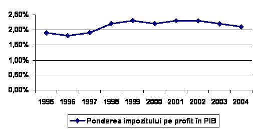 Ponderea in produsul intern brut inregistrata de impozitul pe profit in perioada 1995 – 2004 este surprinsa in continuare:
