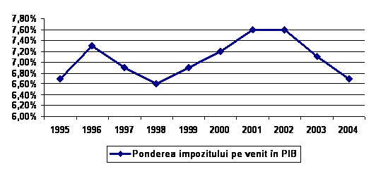 Ponderea detinuta de impozitul pe venit in produsul intern brut, intr-o perioada de zece ani calendaristici, respectiv 1995 – 2004, este: