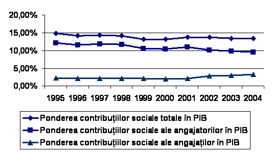 Contributiile de asigurari sociale au o pondere importanta in totalul veniturilor publice. Ponderea detinuta de acestea, in expresie cumulata, precum si diferentiat pe cele doua categorii principale de contributori, respectiv angajatori si angajati, in produsul intern brut, in perioada 1995 – 2004 este reflectata in tabelul urmator: