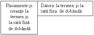 •pe piete nestandardizate, de tranzactii la termen forward si swap. Acoperirea unei datorii, impotriva riscului de scadere a dobanzii de piata, se face prin cumpararea, in compensare, de contracte la termen (active financiare), la aceeasi scadenta si cu aceeasi dobanda. Pierderile ce vor fi inregistrate la datorii vor fi compensate de cresterea valorii contractelor la termen. S-au sintetizat pe plan international mai multe tipuri de contracte la termen de dobanda: forward-forward, forward rate agreement, swap de rata de dobanda;