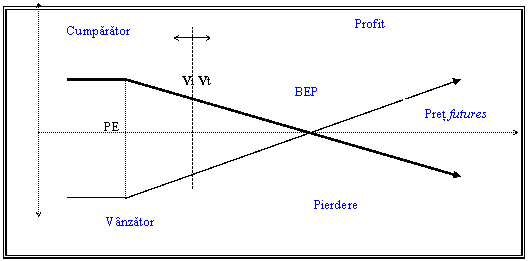 Vânzatorul, la rândul sau, în perspectiva, va deveni long în mijlocul de plata (pe care îl va detine în momentul livrarii si cu care îsi va încheia pozitia short deschisa pe marfa). Zona avantajului relativ, a protectiei vânzatorului, va fi cuprinsa de aria (Pf, A, Pp1) când pretul pietei (Pp<Pf), ceea ce corespunde intereselor sale. Zona dezavantajului potential este delimitata de punctele (Pf, B, Pp2), când pretul pietei este mai mare decât pretul de exersare (Pp>Pf).