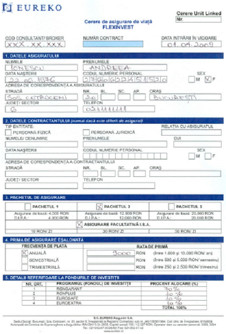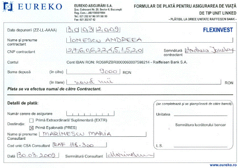 Formularul utilizat pentru plata primei rate a primei de asigurare esalonate este un formular pretiparit emis de EUREKO Asigurari pe hartie autocopiativa in doua exemplare, (“Formular de plata pentru Asigurarea de Viata de tip Unit Linked FLEXINVEST”). Acest formular se va completa conform modelului de mai jos: