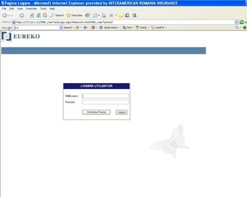 Fiecare utilizator al aplicatiei de ofertare trebuie sa dispuna de un nume de utilizator si de o parola care vor fi generate si transmise de catre EUREKO Asigurari.