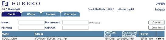 Pasul 2. Pentru a evita inregistrarea unui client de mai multe ori in aplicatia de ofertare, recomadam utilizatorilor sa verifice existenta inregistrarilor referitoare la client cu ajutorul unuia dintre parametrii urmatori: nume, prenume, CNP.