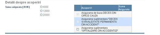 In sectiunea Detalii despre acoperiri utilizatorul va alege una dintre cele trei sume asigurate preferate de client (4.000, 12.000 sau 20.000 Ron), si Asigurarea suplimentara „Spitalizare din accident/zi”, in cazul in care clientul alege astfel.