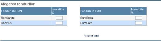 In sectiunea Alegerea fondurilor utilizatorul va alege, in functie de optiunea clientului, fondurile de investitii, precum si alocarea partii din prima de asigurare pentru fiecare dintre cele 4 fonduri.