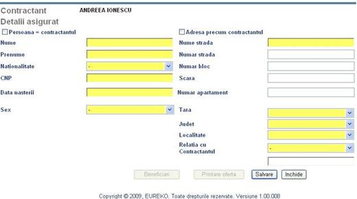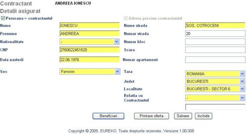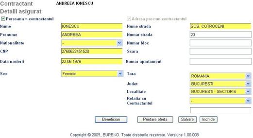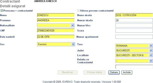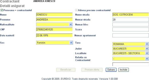 In sectiunea Contractant Detalii asigurat, in cazul in care asiguratul este aceeasi persoana cu contractantul, utilizatorul va bifa corespunzator casuta ‘Persoana = contractantul’.