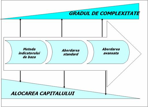 de senzitivitate la risc si formeaza baza pentru alocarea capitalului necesar pentru riscul operational. Bancile sunt sfatuite sa treaca de la abordarile simpliste la cele mai complexe si cu o senzitivitate mai mare la risc iar in cele din urma sa-si dezvolte propriile metode pentru masurarea si controlul riscului. In acest sens aceste abordari urmeaza un design revolutionar dupa cum se vede in figura de mai jos: