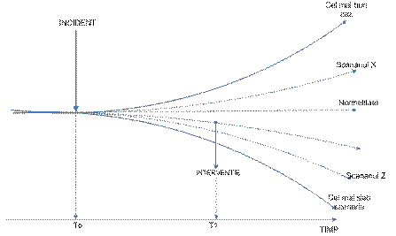 Un exemplu de scenariu, este cel de mai jos, Figura.5, „scenario funnel” (scenariul palnie), care ne arata intinderea scenariilor si spectrul de situatii de conceput in viitor care se intind sub influenta incidentelor si a interventiei asupra lor de-a lungul timpului.