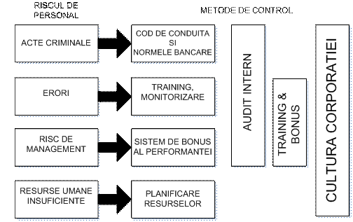 Riscul acesta include toate domeniile de activitate ale bancii in care factorul uman isi pune amprenta, si reprezinta sursa principala de risc. Actiunile persoanelor care nu sunt angajate in banca respectiva sunt considerate influente externe, iar ele vor fi considerate surse de risc operational extern (vezi subcap.5). Numai acele actiuni in urma carora se detecteaza o greseala sau o actiune deliberata a unei persoane angajate care duce la aparitia unui eveniment produs de o persoana externa vor fi luate in calcul in acest subcapitol.
