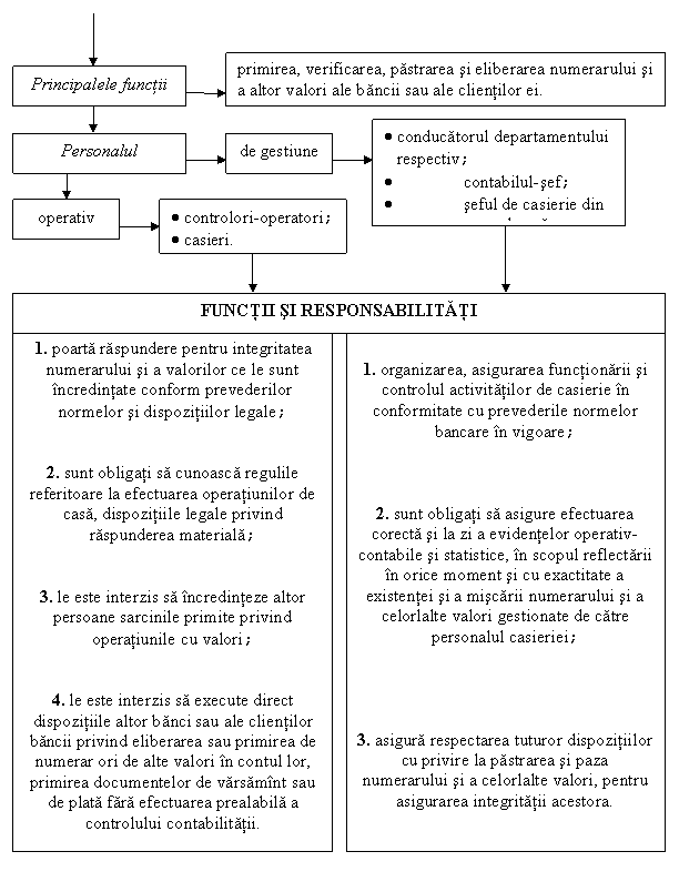 Organizarea casieriei este atributul conducatorului unitatii bancare (in practica se delega atributia directorului adjunct) care are in subordine casierul sef, controlorul-verificator, casierii operativi (inclusiv casierul de pe masinile de transport valori) si verificatorii de bani. In zona casieriei, accesul este interzis oricarei persoane din banca si cu atat mai mult celor din afara bancii. Accesul este permis numai directorului/directorului adjunct si detinatorilor de chei, precum si organelor de control ale bancii delegate in acest scop. Pentru a se evita anumite suspiciuni, la inceperea programului de lucru, intreg personalul casieriei, inclusiv seful de serviciu, preda valorile banesti aflate asupra lor unei persoane special desemnate si se consemneaza intr-un registru suma depusa. La plecarea din banca, sumele se restituie persoanelor care le-au depus.