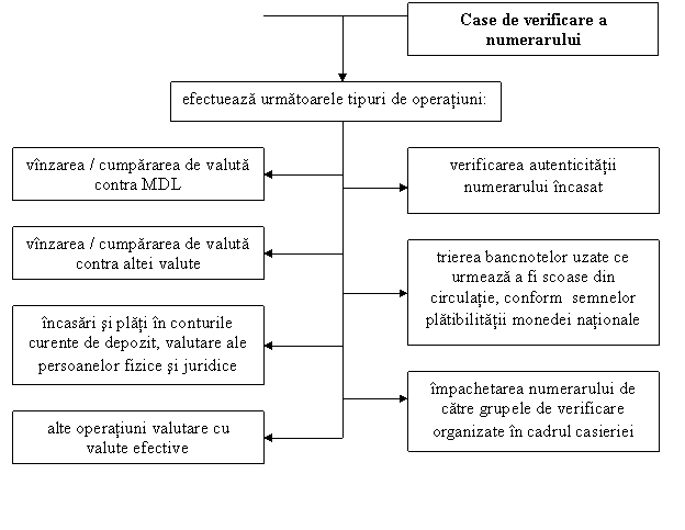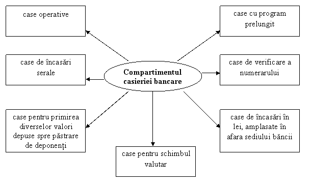 Fiecare banca este obligata sa aiba amenajat un compartiment de casierie prin intermediul careia va acorda clientilor sai servicii de depunere si de extragere de numerar, servicii de convertire a unei valute in alta, verificarea si numararea numerarului.