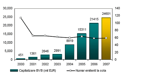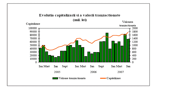 Pe ansamblu, capitalizarea cumulata (BVB si Rasdaq) a totalizat 110,4 miliarde lei, concretizata într-o crestere cu 31,3% fata de finele anului 2006. Ca pondere în PIB-ul estimat pentru anul 2007, capitalizarea a atins nivelul de 28,2%.