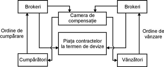 Participantii de pe pietele contractelor la termen de devize adreseaza ordine de cumparare sau de vânzare de valuta la anumite termene prin intermediul brokerilor sau curtierilor agreati de organismele de supraveghere a burselor. Brokerii sau curtierii negociaza tranzactiile de vânzare sau cumparare în numele clientilor si conform ordinelor primite. La scadenta se determina efectele operatiunilor de pe piata si se regleaza diferentele prin intermediul camerelor de compensatie.