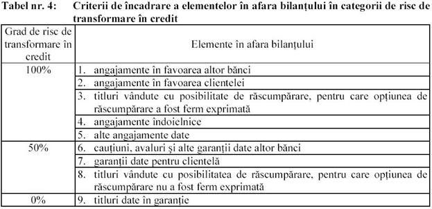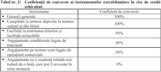 Reglementarile prudentiale au definit o metoda practica pentru a integra activitatile extrabilantiere in calculul raportului de solvabilitate: angajamentele extrabilantiere sunt transformate in risc echivalent prin aplicarea unor factori de conversie, in functie de gradul de risc. Coeficientii de ponderare si de conversie in risc echivalent sunt prezentati in tabelele urmatoare: