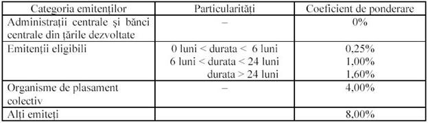 Riscul specific este apreciat diferit in functie de natura emitentului, fiind introdusa notiunea de emitent eligibil[2]. Acesti emitenti beneficiaza de un coeficient de ponderare mai scazut.