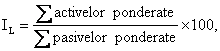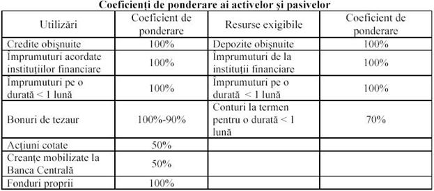 de unde rezulta ca utilizarile si resursele trebuie ponderate in functie de gradul de lichiditate sau exigibilitate, dupa coeficientii de ponderare care variaza de la 100% pana la 50%. O importanta particulara este acordata operatiunilor de trezorerie si tilurilor de stat, care sunt ponderate cu 100%. In schimb, alte creante, ca de exemplu actiunile cotate sau creantele mobilizabile de la banca centrala, sunt ponderate cu 50%.