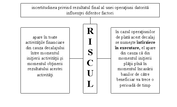 Riscul reprezinta incertitudinea privind rezultatul final al unei operatiuni datorita influentei diferitor factori. El apare in toate activitatile financiare din cauza decalajului intre momentul initierii activitatii si momentul obtinerii rezultatului acestei activitati. Astfel datorita ruperii in timp a acestor momente pe aceasta durata pot aparea diferiti factori care influenteaza rezul 616d38g tatul atit pozitiv cit si negativ. In cazul operatiunilor de plata acest decalaj se numeste intirziere in executare si el apare din cauza ca din momentul initierii platii pina in momentul incasarii banilor de catre beneficiar va trece o perioada de timp. Cu cit intervalul de timp va fi mai mare cu atit operatiunile sunt mai riscante, iar platile de o durata mai scurta sunt mai putin riscante. Platile efectuate in numerar sunt cele mai putin riscante din acest punct de vedere.