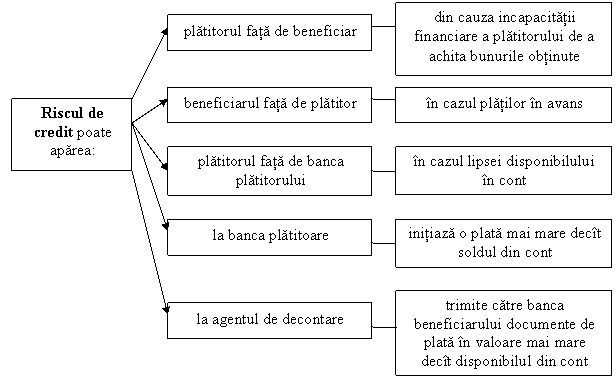 Riscul de credit – probabilitatea ca pe parcursul derularii oparatiunilor de plata una din partile implicate nu-si poate realiza dreptul de incasare a creantelor. Acest risc poate aparea la oricare dintre participantii operatiunilor de plata (platitor, banca platitoare, banca intermediara, banca beneficiara).