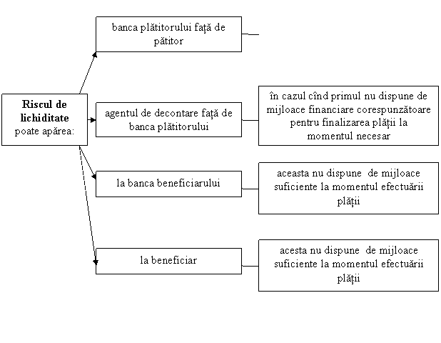 -Riscul nefinalizarii platii datorita lipsei de lichiditate a bancii platitoare, care este destul de rar datorita supravegherii exercitata de banca centrala si a multiplelor posibilitati de asigurare a lichiditatii pentru o banca.