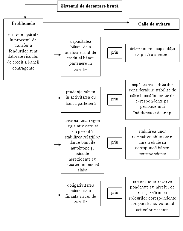 In cazul sistemului de decontare bruta sau compensarii bilaterale, riscurile aparute in procesul de transfer a fondurilor sunt datorate riscului de credit a bancii contragente. Caile de evitare a acestui risc sunt: