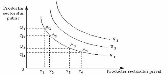 Modificarea alocarilor dintre cele doua sectoare se evidentiaza prin miscarea unui punct de-a lungul curbei de indiferenta. Astfel, o diminuare considerabila a productiei sectorului public, evidentiata de miscarea unui punct pe curba U1 din care A1 in A2, genereaza o crestere redusa a productiei sectorului privat de la X1 la X2. Deplasarea unui punct din B3 in B4 semnifica o crestere importanta a sectorului privat fata de o reducere mai mica a productiei sectorului public de la Q3 la Q4.