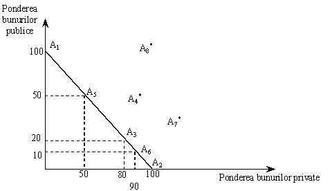 Restrictia bugetara este linia dreapta care uneste punctele A1 si A2. Toate celelalte puncte (A4*, A7*, A8*) situate dincolo de A1A2 nu pot fi atinse cu ajutorul resurselor disponibile existente la un moment dat. Sa presupunem ca punctul A3 reprezinta alocarea resurselor care satisface preferintele consumatorilor la un moment dat, si prin urmare il consideram punctul optim al alocarii intersectoriale a resurselor. In acest caz, punctele A5 si A6 sunt puncte ale alocarii sub optimale, iar productia de bunuri private si publice corespunzatoare acestora nu asigura indiferenta in consum a populatiei.