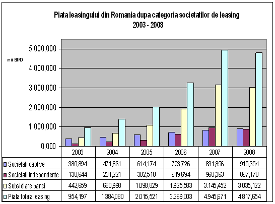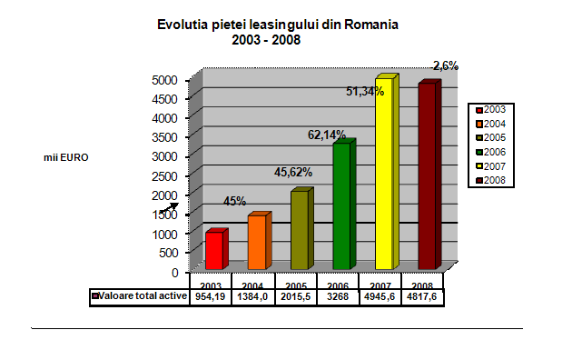 In Graficul 1. Evolutia pietei leasingului din Romania in perioada 2003-2008 se poate vedea faptul ca aceasta piata a leasingului s-a dezvoltat foarte mult in ultimii ani. De la aproximativ 954 de milioane de euro in 2003 s-a ajuns la cca. 4,945 miliarde euro in 2007, avand un permanent trend ascendent pe toata aceasta perioada. In plus, potentialul estimat de catre ALB privind valoarea totala a activelor finantate pe piata leasingului pentru anul 2008 se ridica la aproximativ 6 mld. Euro, si se astepta ca societatile de leasing sa cunoasca un varf al activitatii in trimestrele doi si patru ale anului 2008. Mai mult, pentru anul 2009 era prognozata o crestere de circa 20% – 30%. Cu toate acestea, atat conditiile economice neprielnice de la sfarsitul anului 2008, cat si masurile controversate adoptate de guvernanti au afectat puternic activitatea societatilor de leasing, provocand un regres substanṭial si generand o scadere de 2,6% a pietei leasingului romanesc in anul 2008.