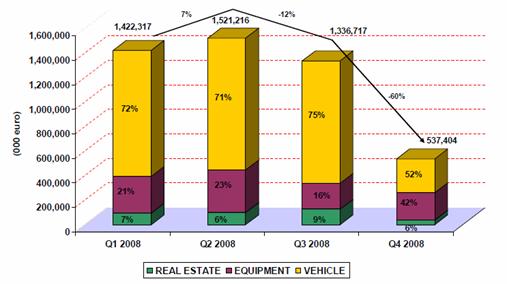 Mai jos se prezinta totodata informatii cu privire la variatia trimestriala in anul 2008 a ponderilor valorilor activelor finantate in leasing, in functie de bunurile ce fac obiectul activitatilor de leasing. Acestea se grupeaza in trei mari categorii si anume: vehicule (vehicle), echipamente (equipment) si respectiv bunuri imobiliare (real estate). Grafic se constata faptul ca ponderea vehiculelor din total, desi se mentine peste nivelul mediu de 50% si in ultimul trimestru al anului 2008, a inregistrat o reducere semnificativa, de 23%, pe fondul diminuarii solicitarilor de autoturisme noi, in favoarea celor second hand. Acest aspect intareste convingerile reprezentantilor societatilor de leasing cu privire la impactul defavorabil al introducerii taxei de poluare asupra vanzarilor auto.