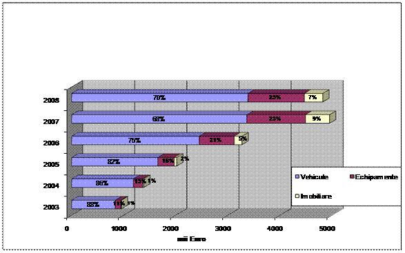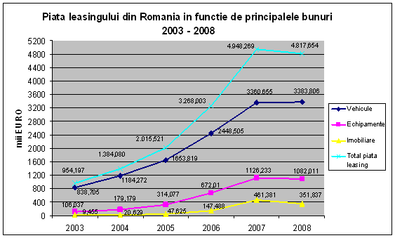 Atat piata leasingului in ansamblu, cat si toate componentele acesteia descrise de cele trei tipuri principale de bunuri care fac obiectul contractului (vehicule, echipamente si imobiliare) prezinta o evolutie ascendenta pe intreaga perioada a anilor 2003 – 2007. In anul 2008 insa, doar contractele de leasing privind vehiculele mai inregistreaza o crestere fata de anul anterior, dar si aceasta la un nivel extrem de redus de doar 0,67%. Valoarea totala a contractelor de leasing in 2008 este de 4.817,654 mii euro, din care nivelul vehiculelor finantate prin leasing este de 3383,806 mii euro, al echipamentelor de 1082,011 mii euro, iar nivelul bunurilor imobiliare finantate prin leasing este de 351,837 mii euro. Valoarea contractelor de finantare a echipamentelor industriale prin leasing a inregistrat o scadere de 3,9% fata de anul precedent in timp ce sectorul imobiliar a inregistrat un regres considerabil de 24% in acelasi interval de timp. Aceasta reducere poate fi explicata de impactul crizei financiare internationale asupra domeniului imobiliar, cauzand o inghetare a tranzactiilor imobiliare si respectiv a activitatilor de constructii.