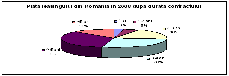 Din punct de vedere al duratei derularii contractelor de leasing in Romania in anul 2008, ponderea cea mai mare de 33% o detin contractele cu durata de desfasurate de 4-5 ani, urmate de contractele cu durata de 3-4 ani (28%) si respectiv de contractele cu durata de 2-3 ani in proportie de 18%. Mai putin solicitate au fost insa contractele pe perioada mai mare de 5 ani (doar 13%), precum si de cele de 1-2 ani (5%) sau de 1 an, ce detin de altfel, cea mai mica pondere de doar 3%. Statisticile au fost redate in urmӑtorul grafic.