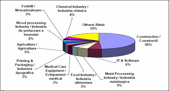 In ceea ce priveste structura contractelor de finantare a echipamentelor industriale pentru anul 2008 in leasing, aceasta este redata in Graficul 6. Piata leasingului din Romania in 2008. Cele mai numeroase solicitari de echipamente in leasing s-au inregistrat in constructii, avand o pondere de 50%. Cu toate acestea, in 2009 se asteapta o reducere a volumului lor, ca urmare a cadrului economic nefavorabil si al diminuarii considerabile a cererii imobiliare.