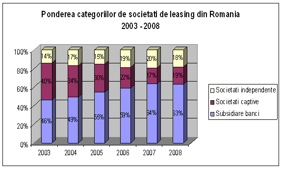 Se constata faptul ca societatile de leasing subsidiare bancilor detin pe intreaga perioada analizata cea mai mare pondere, inregistrand totodata un permanent trend crescator, pana in anul 2007, in contrast cu societatile captive, a caror pondere din totalul activelor finantate continua sa scada. In 2008 insa, se inregistreaza o scadere de 1%, in defavoarea societatilor de leasing captive, a caror aport la valoarea totala a activelor creste cu 2%, in timp ce ponderea societatilor indepenedente scade in aceeasi masura, ajungand la 18%. Astfel, la sfarsitul anului 2008, piata este dominata de societatile apartinand marilor grupuri financiar-bancare (63%), urmate de cele captive unor producatori (19%) si societatile independente (18%). Aceasta concentrare a volumului in majoritatea dominata de societatile apartinand marilor grupuri bancare se inscrie in dinamica clasica a pietelor de leasing in dezvoltare.