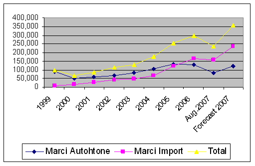 Din grafic se observa ca in perioada 1999-2000 achizitionarea de autovhicule din categoria marcilor autohtone prezinta o scadere la jumatate a numarului de unitati cumparate de la 100.000 la 50.000. Incepand cu anul 2001 acestea cunosc o usoara crestere ajungand la mijlocul anului 2005 la un numar de unitati achizitionate de aproximativ 150.000. Piata prezinta o usoara stagnare in 2005 -2006 in ceea ce priveste achizitionarea de marci autohtone de autovehicule. Incepand cu anul 2006 aceasta incepe sa prezinte o scadere semnificativa pana la jumatatea anului 2007 de unde inregistreaza o crestere rapida.