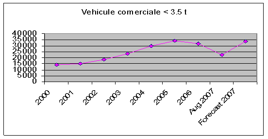 Incepand cu anul 2000 piata vanzarilor de autovehicule comerciale < 3,5 t cunoaste o crestere continua de la 15.000 de unitati la 35.000 de unitati in anul 2005. Incepand cu acest an se observa din graficul de mai sus o scadere brusca pana la jumatatea anului 2007 de la 35.000 de unitati achizitionate la aproximativ 20.000 de unitati astfel ca din acel moment piata sa prezinte din nou o crestere a nivelului vanzarilor.