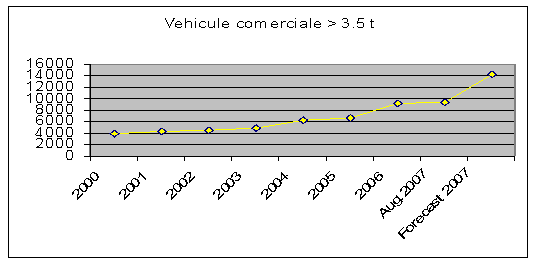 Analizand graficul de mai jos se observa ca vanzarile de vehicule comerciale > 3,5 t prezinta o screstere lenta incepand cu jumatatea anului 2000 de la 4000 de unitati ajungand in anul 2006 doar la 10.000 de unitati. Aproximativ un an evolutia vanzarilor cunoaste o stagnare pana la jumatatea anului 2007. Dupa cum se observa mijlocul anului 2007 prezinta pentru evolutia vanzarilor de autovehicule comerciale > 3,5 t o crestere semnificativa de aproximativ 14.000 de unitati.