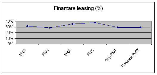 Evolutia finantari prin leasing a autovehiculele cunoaste o usoara scadere incepand cu anul 2003 de la peste 30% la 29 % pana la jumatatea anului 2004. Incepand cu anul 2004 nivelul finantarii prin leasing a autovehiculelor ajunge la un procent de aproximativ 40% la jumatatea anului 2006. Analizand in detaliu graficul de mai sus se poate observa ca incepand cu mijlocul anului 2006 aceasta prezinta o scadere destul de semnificativa de peste 10% pana la jumatatea anului 2007. De-a lungul anului 2007 aceasta prezinta o stagnare.